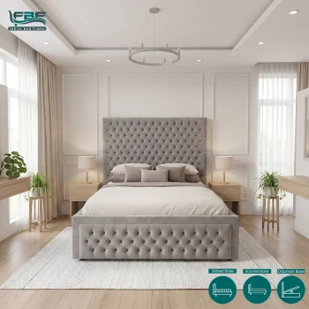 The Athena Ambassador Chesterfield Bed Frame combines elegant button-tufted Chesterfield styling with a bold ambassador silhouette. With ottoman storage, adjustable headboard heights, and matching or diamond button options, it offers luxury and practicality.